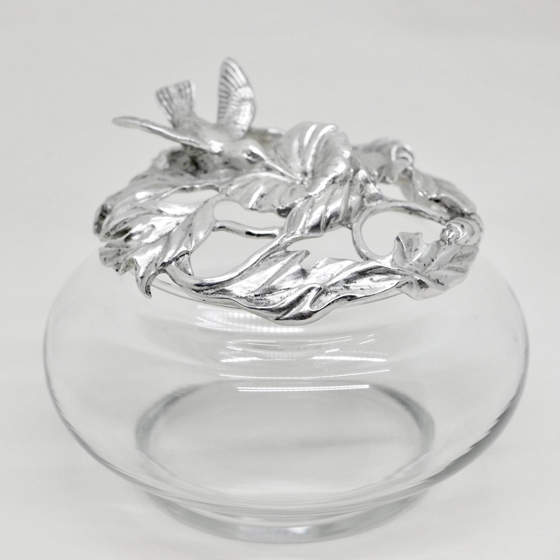 This elegant piece was discovered at a vintage market in Zurich and features a beautifully crafted pewter lid designed by Seagull Pewter Canada in 1995. The lid showcases an intricate hummingbird and floral motif, perfectly complementing the clear glass vase. This combination makes it both functional and decorative, ideal as a centerpiece, jewelry holder, or for serving chocolates and dried fruits.